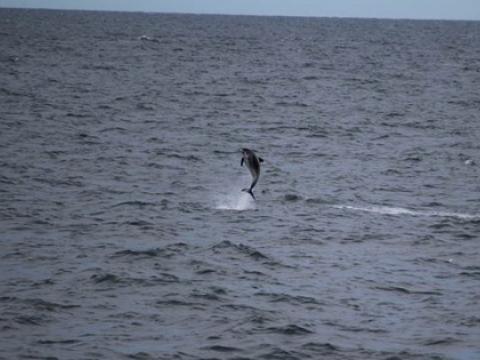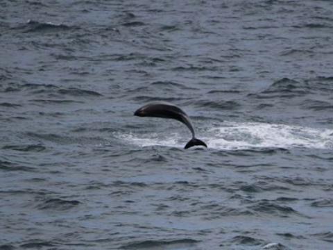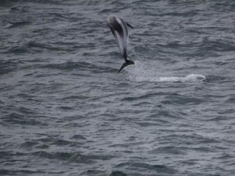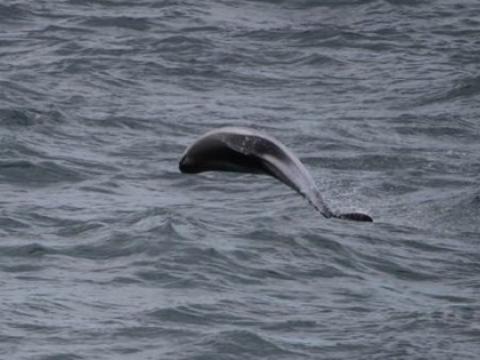 Report from Hafsúlan: We headed out from Reykjavík and the weather was a little wavy. We stopped by Akurey to see the puffins and there were quite a few in front of the island and flying around the boat. We headed out to sea and saw many flocks of birds, but no signs of whales. Eventually we spotted a blow and waited to see if this whale would come up again, but it disappeared. We saw many northern gannets diving from the air down into the water. We saw another minke whale, but again this whale did not surface many times. All of the sudden just as we were about to make our way back to the harbour some White-Beaked Dolphins appeared right in front of the boat. The rode along the bow and played along side the boat. Some of them even breached jumping out of the water and rolling in the air. It was a great way to end our tour. Despite not seeing these minke whales too well we were all very happy to have seen some dolphins.