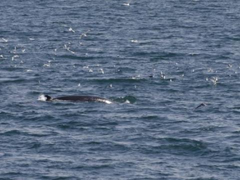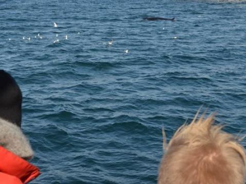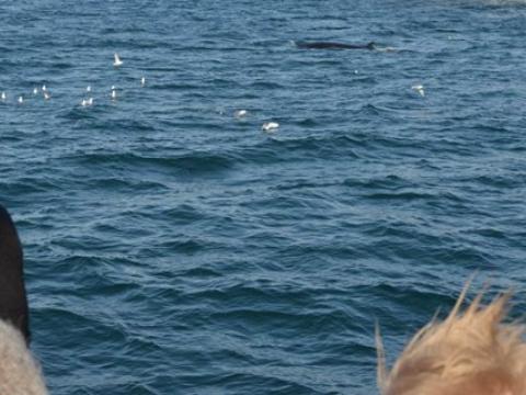 Report from Hafsúlan: This morning we headed out under the most beautiful  and calm conditions imaginable. The skies were blue and were promising a great whale watching adventure. Leaving the habour we were surrounded by hundreds and thousands of flying, resting and diving Puffins. With the sun warming our backs we made our way far out in the Bay of Faxaflói, where we suspected whales due to the large flocks of birds. Finally, we encountered a very joyful and particularly hungry Minke Whale. The individual, which we later identified as Happy, was feeding extensively. Rolling around, lunging, changing course and blowing bubbles underwater quite frequently, the whale seemed undisturbed by our vessel. At times the whale came even as close as 5-10m. Eventually, we headed out further into the bay where we were able to spot Harbour Porpoises 10-20 animals all around the boat. They were fast and elusive, but popped up here and there, even on our journey back to the harbour. Yet again, we are able to see ´Happy´the Minke Whale feeding as we were heading back.