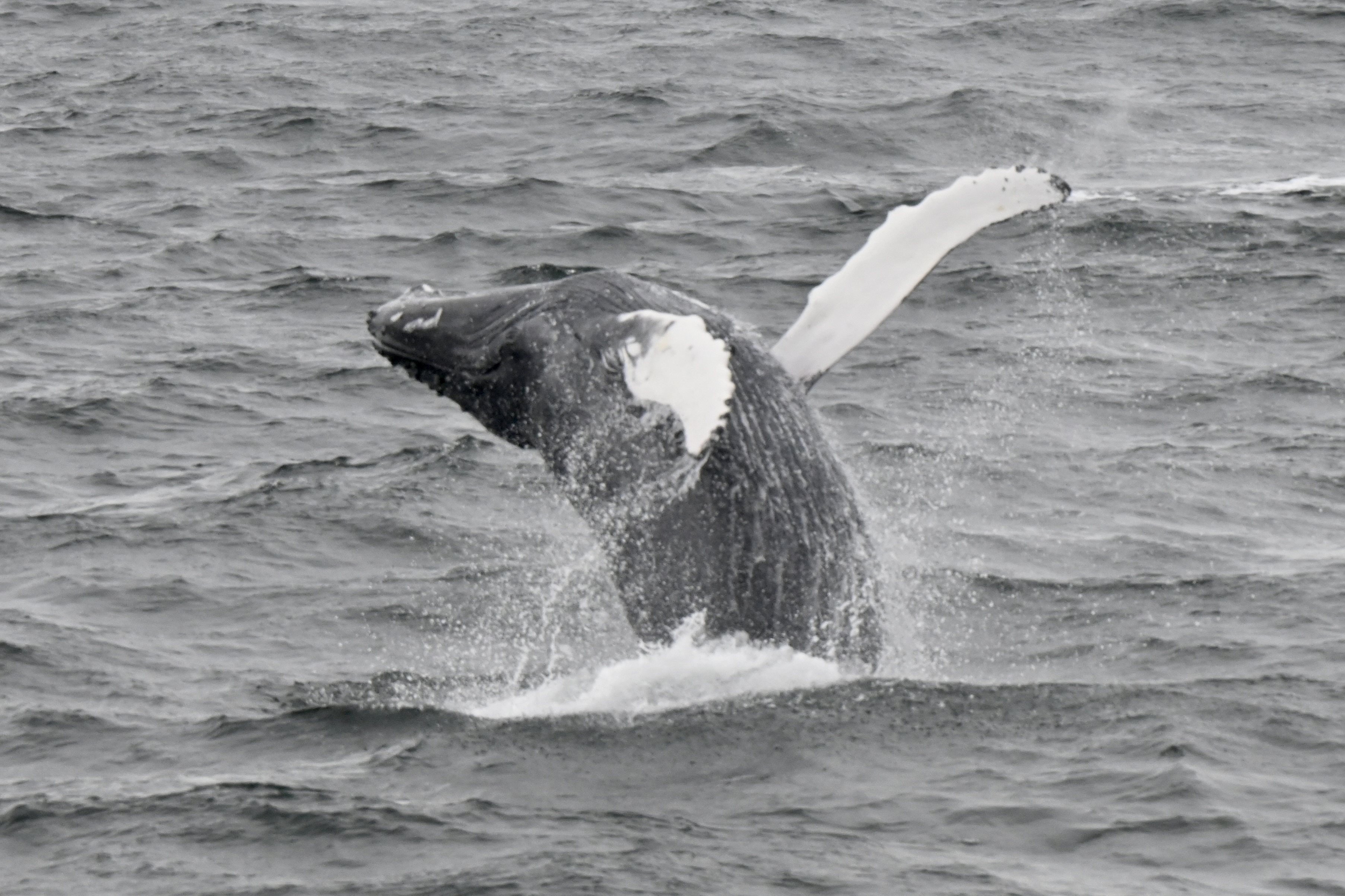 Report from Hafsulan: We sailed out into the grey bay, eager to explore the unknown. There was a bit of swell as we sailed out as we were sailing into the waves. After a bit of searching we spotted a blow in the distance! We had found a humpback whale! We continued towards it and it started breaching! It was breaching for quite some time directly next to us! It did change direction a few times but would always come up and then often breach again! We tried to stay as long as we could but eventually ran out of time and had to head back to land!