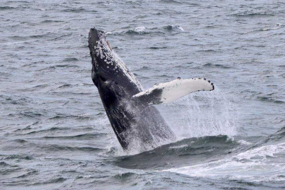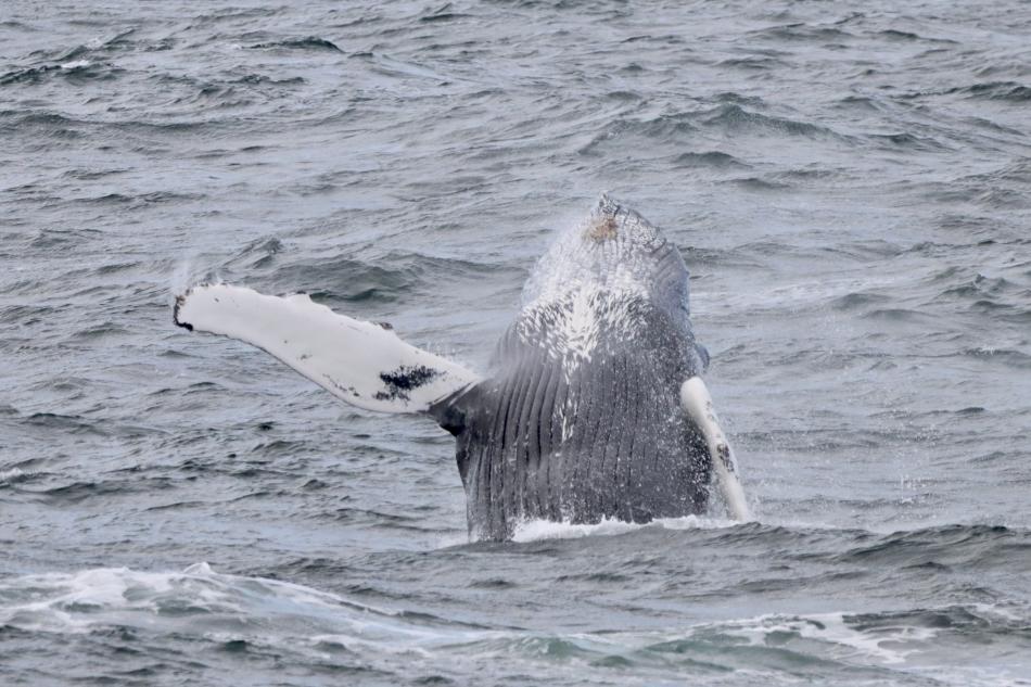 Report from Eldey: This morning we sailed out into the same area where we had been spotting whales in the days prior, an active feeding ground with lots of birdlife! And our luck was with us today as we spotted one humpback whale! This whale was taking very shallow dives and once we got closer, it breached twice! We continued to watch this humpback surface and come up again, still taking shallow dives, and then it began breaching again! It did a sequence of about 7 breaches before rolling over and lifting its pectoral fins high up in the air, slapping them on the surface so loud the impact could be heard from all directions. It continued to slap its fins for a few more minutes before continuing on its journey. We then said goodbye to this whale and it said goodbye back by showing us a fluke dive! On the way back to harbour we briefly saw a small pod of 4-5 white-beaked dolphins to end this amazing tour!