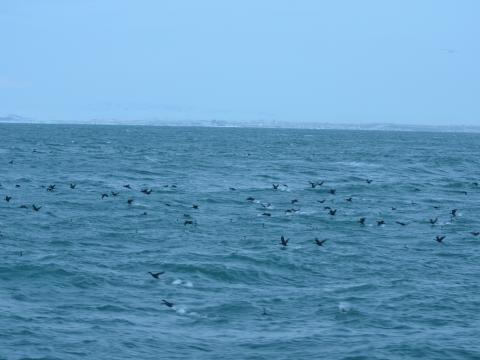 Report from Hafsúlan: Today we went out from Hafnarfjörður as there we would be mostly sheltered from the wind and sailed towards Reykjavik but first we went a little to the west along the Vatnsleysuströnd coastline. The whole time there was some swell, cold and windy but even worse was the cloudy conditions; for almost one hour after we left the harbour, we had very little visibility, only 400-500 meters sometimes, which did not work well as we need more visibility when we are searching for cetaceans. But then it started to get better around the time when we turned towards Reykjavik. There was a lot of birds out on the water today; mainly various seagulls and northern fulmars, as well as one very large group of european shaqs, but sadly we could not find any cetaceans. All were hence provided with complimentary return tickets so that they can come back to us free of charge for another whale-watching trip within the next two years.