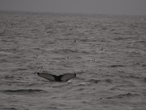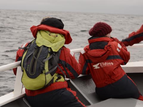 Report from Eldey: We set sail on a slightly damp but otherwise fairly warm day. It was smooth sailing until we reached further out into the bay where we experienced a few swells. After sailing out into the bay a blow of a humpback whale was spotted a kilometer in the distance so the boat headed in that direction. On arrival we watched this magestic animal surface multiple times and raise its fluke allowing us to identify this animal as Picasso. Picasso is a humpback which was first identified in Faxaflói bay in 2014 and has been a regular visitor to the bay in the last few weeks. While watching Picasso surface a minke whale was also spotted only 200 meters away! This minke surfaced a few times but due to the swells it may have been a bit difficult to spot. As time was running out Eldey began its sail back to Reykjavik, a lone white-beaked dolphin was then spotted a 100 meters away, it was rather odd that this animal was travelling alone as dolphins usually travel in pods of about 5-6 individuals, but it was traveling very fast and so was only spotted twice. The sail back was fairly smooth with less wind and less swells when suddenly a minke whale surfaced only 20 meters from the boat, you could even see its blowholes coming up from the waters surface! It was really amazing, so close and so unexpected!