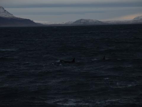 Report from Hafsúlan: And there were Orcas! Yay! Our first since July! The tour started with another boat telling us that they had seen a few white-beaked dolphins but by the time we arrived, the dolphins had vanished. Disappointed, but knowing we had the whole tour ahead of us, we continued further out in search of something else but did not find anything. It was a strong eastern wind but thanks to the skillful work of Captain Jón, we hardly felt it until we were on the way back but then most passengers were too happy to even notice. Why? Here's why! Suddenly a dorsal fin appeared about 300 meters away and it looked too tall to be that of a dolphin. As we got closer, we saw that it was actually one of a dolphin but belonged to a specimen of the largest of the dolphins, and that it wasn't alone. We had come across our very first Orcas since July! This was a pod of 5-8, including one old bull with a curved dorsal fin, at least three cows, and one calf. Gosh it was hard to leave but we were running out of time. However, it is good to have them back and hopefully they will stick around for a while (Photos: Charla Basran & Heiður Ósk).