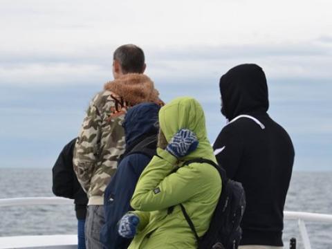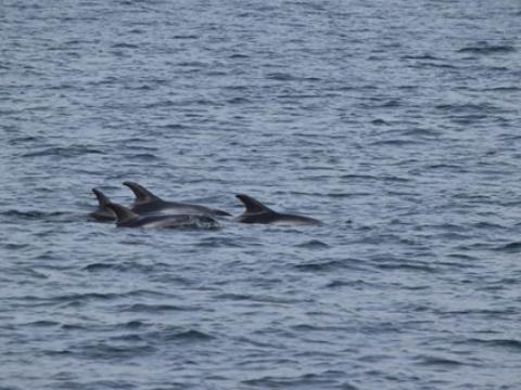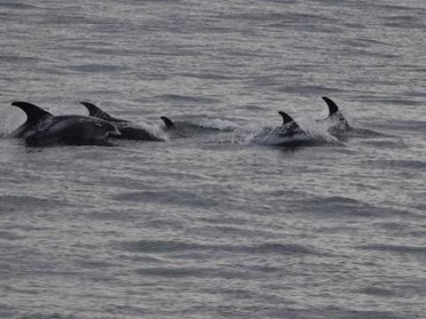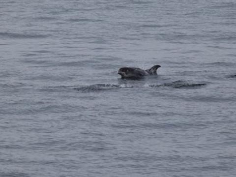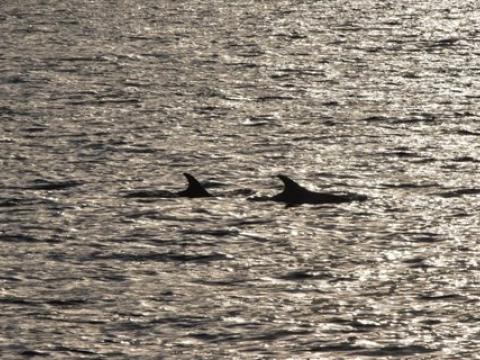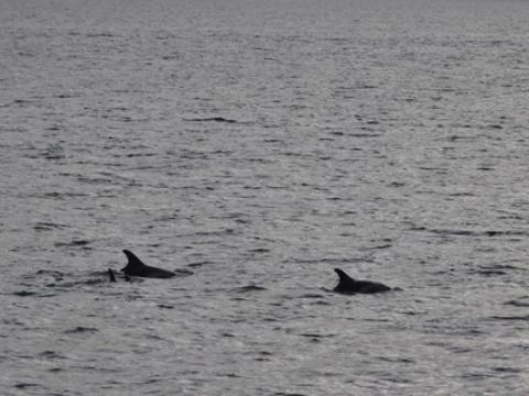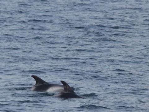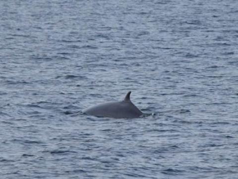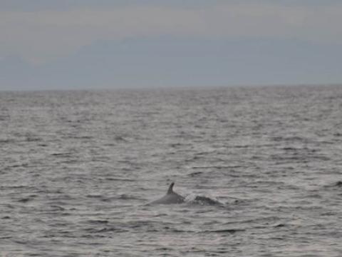Report from Hafsúlan: Finally the cloud cover broke up more so that we could enjoy the sunshine on us, but also on certain parts of our surroundings like the mountain chain Esja or the capital Reykjavik. We found 2 minke whales which we could not identify, one closer and one a bit further on the other side. In the end we saw both appearing alternately on two different places in a very short time interval so it was impossible to be the same. To not disturb these whales we continued on where we saw two pods of white-beaked dolphins first we watched one group and then the other, both of approximately 6 individuals so around 12 in total. We could count the dolphins very well because when they were travelling they were surfacing together in tight groups. It was a very beautiful sight watching their dark silhouettes in the Sun's glare and as well shimmering in the golden light on their wet skin showing their black and white striped pattern across their body. Then we left them in peace and spotted our third cetacean species with a harbour porpoise coming up several times before we went back towards Reykjavik.
