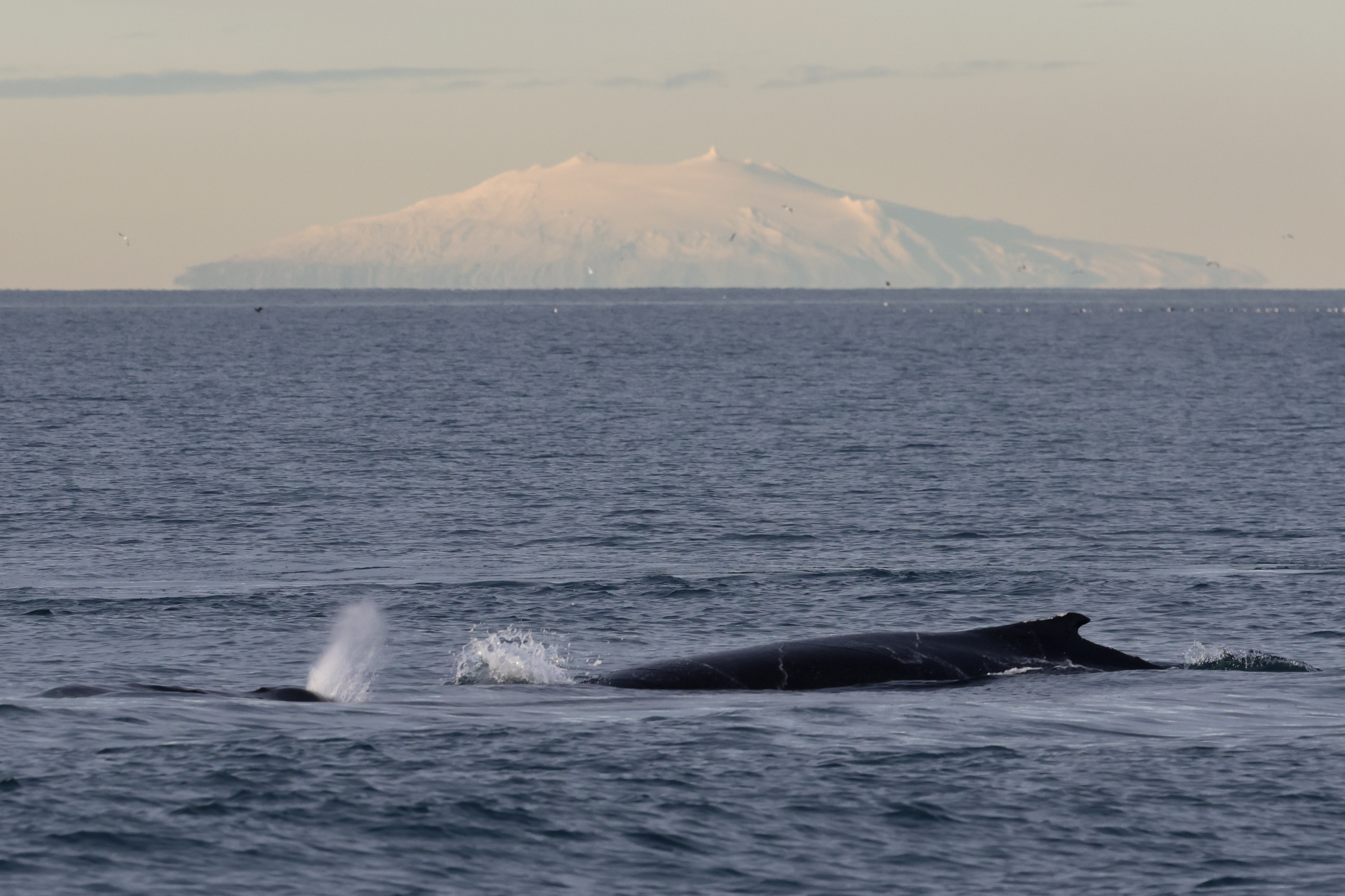 Report from Eldey: We sailed out towards a beautiful sunrise, into flat seas this morning. It didn't take too long before we saw our familiar 2 humpback whales surface right next to us again. Banana was swimming rather calm as they were clearly diving to feed, but the other whale had a bunch of energy. They lunged out the water multiple times and even playfully rolled on its side! After a fun time with these whales we searched around a bit more but at no result. This meant we turned back for a little longer towards these 2 humpbacks, enjoying their company a bit more before ending our tour, now with a bright sun overhead.