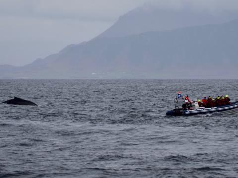 Report from Eldey: Rain had stopped and the waves also calmed, making it a beautiful evening to go out. During the first hour we had numerous of the cute harbour porpoises passing by. There were so many of them like we rarely see, obviously there must have been plenty of fish for them today to eat. Due to the amazing visibility, we spotted a black shape more than 2 km away that we, once getting closer, recognized to be the humpback whale we had seen on both previous tours. And to make the situation even more unique, we spotted a minke whale and harbour porpoises in the exact same moment! The humpaback was milling, so moving very slowly, almost resting, and came again very close to our boat. It was extremely funny when we noticed that it had a terribly smelly breath, coming from the bacteria and the fish it was digesting. After almost an hours stay, we left it to be on it's own as part of our code of conduct. On the way back the light of the setting sun was stunning and so romantic and, to top off the tours end, we even sighted a minke whale! Definitely, one of the most beautiful tours I've ever guided.