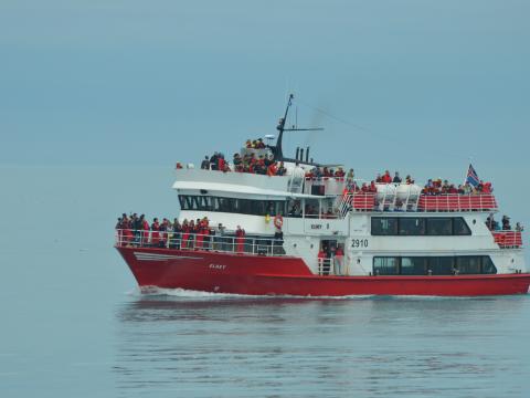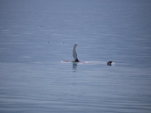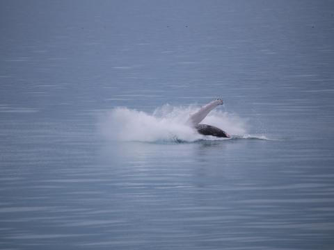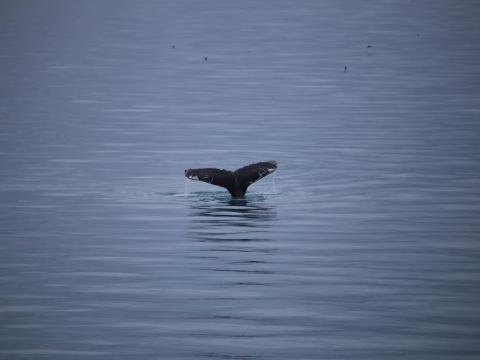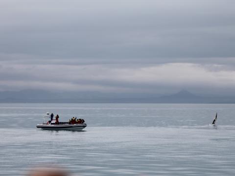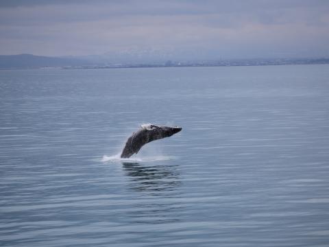 Report from Elding: The wind had picked up a little since the morning but it was still great conditions for cetacean spotting. We had not even been going a half hour when we crossed the path of several harbour porpoises! As soon as we saw 3 come up approximately 200 m in front of the boat we also saw a minke whale in the same direction around 500 m out. Although the porpoises were not shying away from the boat we decided to follow up on the minke, which was a great choice as this led to at least 5 more being spotted in the same area. These were behaving quite elusively so we approached the area where other boats were and came across a pod of 3 white-beaked dolphins, including one juvenile which at one point jumped and rotated to land belly up next to an adult. As we were following this pod a humpback whale came up within 100 m of the boat, taking us all by surprise! This humpback was only coming up for 3 breaths at almost 10 minute intervals, so after a half hour we headed towards the direction of a big blow a km out, where we came across another humpback. This individual was surfacing often and resting visibly below the surface to the delight of the photographers on board. After 20 minutes with this individual we were just about to head back when it raised it´s huge white pectoral fins and did a massive tail lob within 100 m of the boat! We took that as a big wave goodbye and headed back to port with a smile on our face.