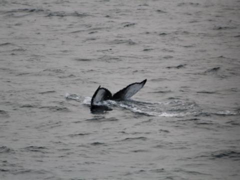 Report from Eldey: Atmosphere on the bay got a tad more christmassy, with snow slowly falling from the sky. We should have read the signs, with Christmas time come the presents. And how spoiled we were! Shortly after departure, we joined another whale watching boat in an area where 2 humpback whales were traveling together! They were moving slowly, straightforward, and in a relaxed fashion. They were regularly diving during long minutes, so we had to be patient, but eventually we got to see the both of them raising the tail stock out of the water. Which is fortunate, because it allowed us to recognize two of our friends: Ragnar, who we encountered for the first time in March 2016, and Shaniqua, who we met first in June 2016 then in Akureyri during summer 2017! It's amazing to meet two known individuals together, what a treat! After following them for a while, we tried our luck further West and quickly sighted a pod of 4-5 elusive white-beaked dolphins before heading home.