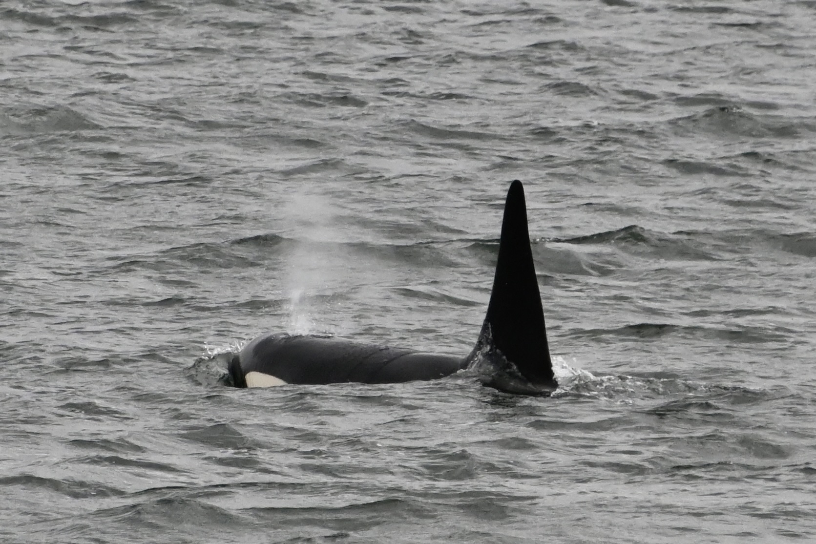 Report from Hafsúlan: As soon as we set off this afternoon we were notified that there was something very exciting swimming in the waters nearby. We headed straight to the given direction and soon thereafter suddenly spotted a large black dorsal fin breaking the surface -it was a large male orca! We all got a close look of this beautiful individual as it was coming up for air while scouring the waters close to land. A slight drizzle came upon us, but everyone was out on deck full of admiration, because this is a sighting you just cannot miss. After a good amount of time we waved goodbye and sailed further out in the bay and were treated with the sight of a relaxed minke whale feeding in the distance. As it was time to head back to the harbour our spotting skills were sharp and we saw another minke whale slowly making its way through the waves. What a wonderful afternoon!!