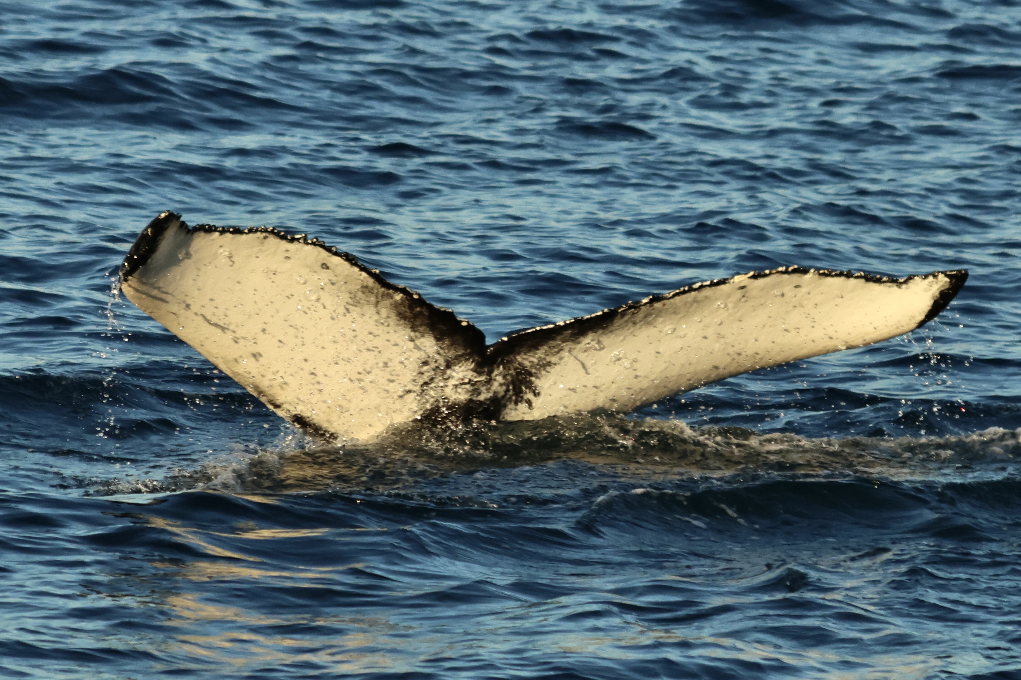 Report from Hafsulan: This afternoon it felt like a summers day (except the cold air) as we sailed out. The skies were clear and blue and the seas calm and we were eager to go out again. We sailed around a bit, enjoying the mountains and hot chocolates and then found an elusive minke whale! It had quite a bit of speed to it but was coming up regularly in-front of the boat. We decided to leave the minke to not overstay our welcome and actually found a humpback whale in the same spot we'd been searching! This one was still resting again, so its likely it was down each time we had a look! Each time it did come up it would show us its gorgeous fluke, also confirming that this whale is the same one seen the last few days named Banana! We stayed a little while before heading back to harbour.