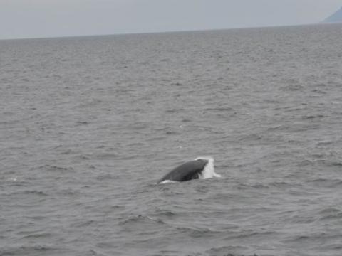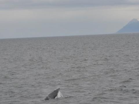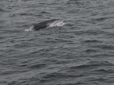 Report from Hafsúlan: This afternoon a a slight cloud cover and a bit of rain accompanied us on our way out into Flaxafloí Bay. On our travels out, we occasionally spotted Harbour Porpoises, but soon enough we were able to spot a group of feeding seabirds. Northern Gannets were shooting into the water causing splashes and giving us the hint that the area was rich with fish. After only minutes we saw a large wave, followed by a splash when a Minke Whale surfaced and rolled around just in midst of the seabirds. As we were soon to find out this Minke Whale was called Midi and has been sighted every year since 2008. Today, Midi must have been particularly hungry as it was launch-feeding, rolling around, shooting to the surface ,and changing directions constantly, often showing off its white-pinkish belly and rows of its baleen plates on his upper jaw. For about 30 minutes we followed him feast like a king amongst large flocks of Arctic Turns. When Midi finally had his fill, we followed him for another while until we headed back into harbour. What a great trip, indeed.
