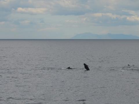 Report from Elding: We first went to see the puffins at the new colony situated on Engey, they were great standing with their white bellies in front of the entrances of their burrows. Then we went out to the bay, saw a difficult minke whale from far and waited so long for it to surface that we decided to search further out, until we heard our sister vessel talking about something unusual they spotted. It was Long-Finned Pilot Whales, more than 100 different individuals very tight to each other, resting at the surface. These animals have very strong family bonds and when they rest you can see how caring and tight to each other they are, keeping contact by touching each other with their fins. We saw them spy-hopping as well and saw flukes out of the water, calves as well. Unfortunately, we stayed only a few minutes with them, and crossed fingers to see them on the next tour. We quickly saw dolphins but weren't sure what species, and figured out later that the Pilot Whales were associated to Atlantic White Sided Dolphins when we sailed at 13h.