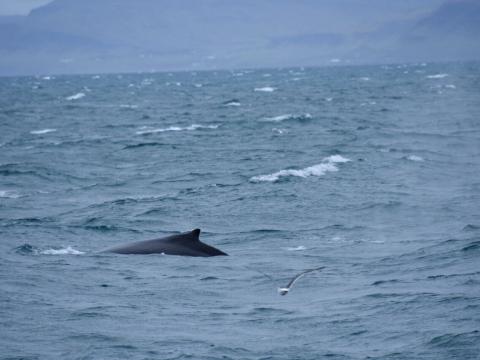 Report from Eldey: With the winds picking up from the north we decided to take a more sheltered route towards our most successful whale watching areas. It was a long time sailing but we enjoyed the beautiful scenery and seabirds on our journey. After an hour our awesome captain Gvendur spotted a small blow and with a little patience a minke whale popped up to to breath just 20 meters from our boat. We had many close surfaces from this individual and after 20 minutes of being able to follow this whale we noticed another minke whale also close by. As we made our way back to port, we could see big splashes in the distance - a minke whale breaching (jumping out of the water and body slamming on the sea surface) it looked relatively close maybe 2 miles away but as we got closer the breaching minke seemed to be getting further away, making us wonder if it was more than one minke breaching as they do this sometimes to communicate with others around. It did at least lead us to a humpback whale and another minke whale. The humpback was feeding and traveling far with each deep dive and as we were far out and in rougher conditions we decided to leave after 5-7 surfaces, but plenty of time to get a few photographs in. 2 harbour porpoises were seen very quickly as we made our way back to port.