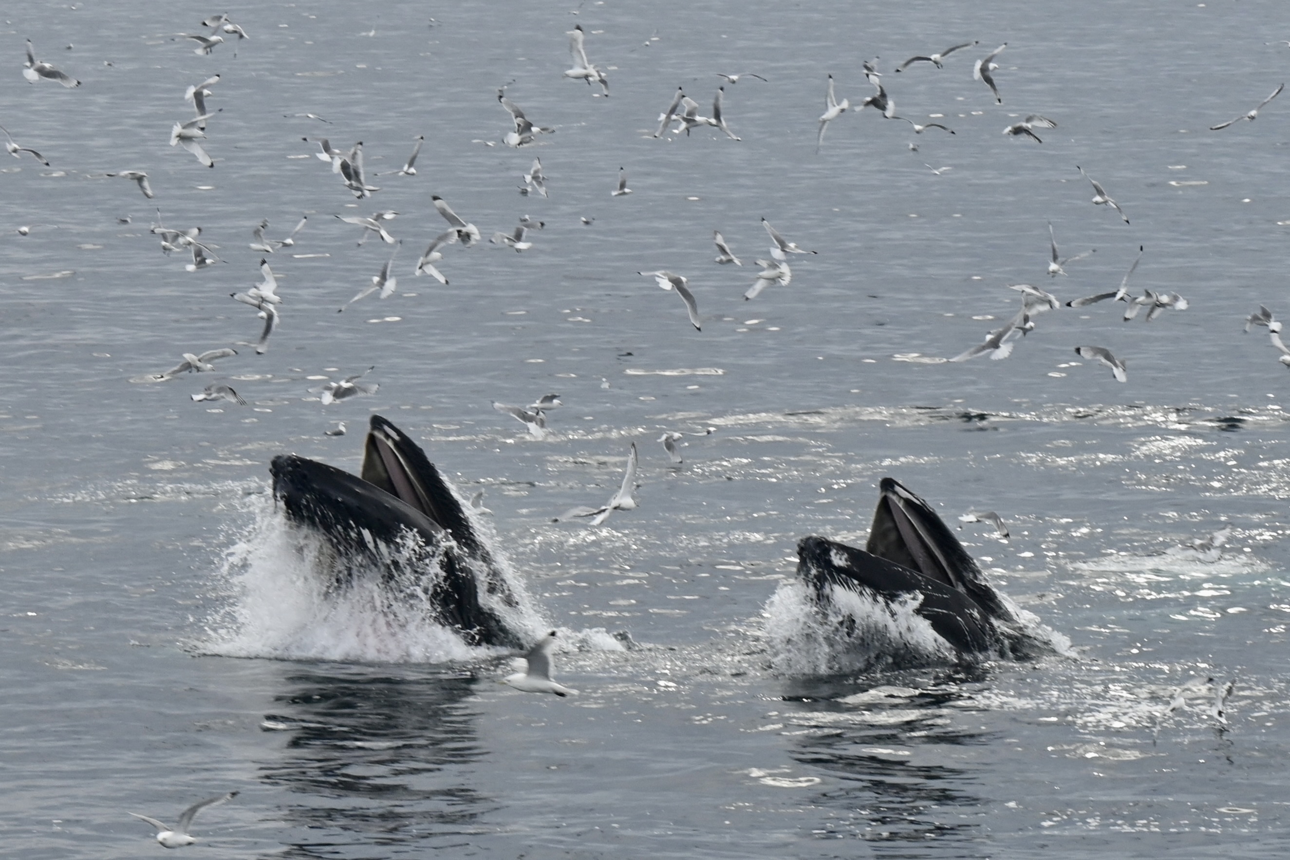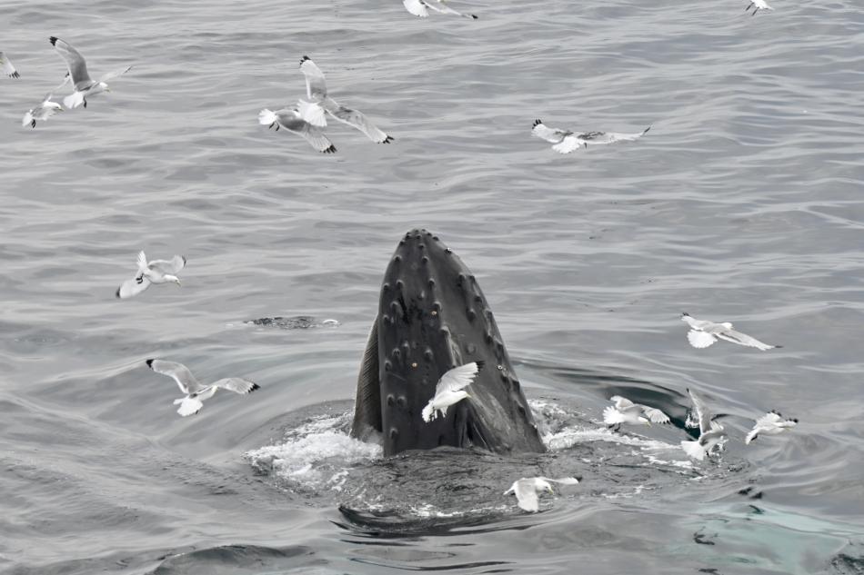Report from Eldey: The seas were still as calm and the sky partially cloudy with a gentle eastern breeze. Unbeknownst, on this tour we were in for the most incredible spectacle. After some sailing we found a spot with around 8 humpback whales bubble-netting. with up to 6 whales at a time participating in a single bubble net and then lungeing out of the water all together. We got to behold one of natures most incredible spectacles this evening, with bubble nets forming often mere meters away from our boat. Among the humpbacks we could also make out a pod of about 6 white beaked dolphins joining the feeding frenzy, as well as 4 (or more) minke whales. This unbelievable show went on for over an hour, as time flew by and we then had to turn back home again entranced and saddened we had to leave this all behind.