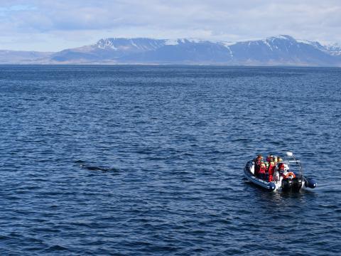 Report from Eldey: This afternoon started of like this morning, calm sea, blue sky and snow covered mountains, so excellent conditions for spending an afternoon whale watching in Faxa bay. After about 25 minutes of sailing out from the old harbour of Reykjavik, we saw 6-8 white-beaked dolphins flashing us with their beautiful stripes. Soon thereafter we also got a glimpse at a minke whale, but decided look further out where another boat had encountered a humpback whale. When we arrived we could see it surfacing and showing us it's fluke. We spotted a second blow in the far distance and started heading there. As it turned out we could not find a humpback, but instead we saw another minke whale and 4-6 harbour porpoises, they were even jumping. After a while, when we had turned around, we first saw a minke whale further away and then encountered another humpback. Everybody was able to get a really good view of this animal as it surfaced only a few meters away from the boat. Then it was time for us to say good-bye and drive back to Reykjavik. Another very nice whale watching tour on this beautiful May day.