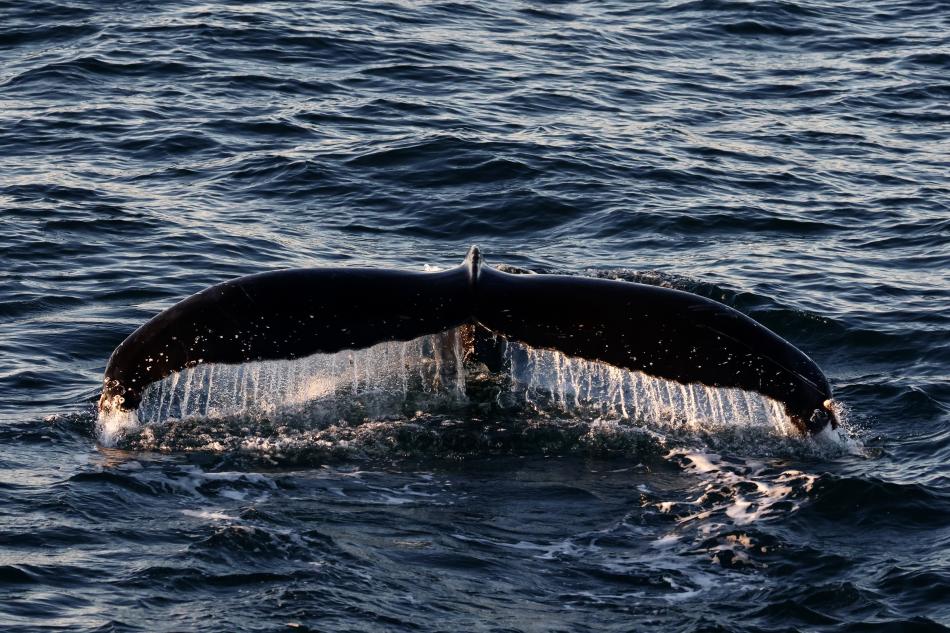 Report from Hafsúla: Our tour started with a bright low sun gazing upon our exit of the harbour a small breeze coming from the mountains. As we were about to sail out to the middle of the sea, a blow was seen near the islands close to Reykjavík! It came from a humpback whale! We were happy to see Banana again, as it has been logging around this area for quite some days. It looked a bit more active while showing us the fluke a few times. We decided to head proper out and search for more marine life. After nearly 40 minutes, another blow was seen under a few birds. It definitely was feeding event. As we got closer we confirmed that it was another humpback whale, diving constantly to get as much food as it could! We stayed with it for a while and even got a glimpse of a grey seal there too. Time was running out and we sailed back to the harbour.