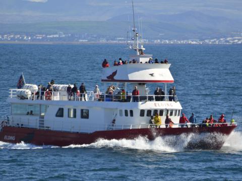 Report from Elding: Sunny morning in Faxaflói, we sailed out leaving the clouds behind and we were ready to have a nice whale watching time. No further away from the port, about 25 minutes we spotted our fist cetacean, and it turned out to be a humpback whale. We could enjoy this animal for a while looking at the blow and the back of the animal, however we didn´t see the fluke this time. We kept going out and we ended up with a group of white beaked dolphins that were all around the area. They were playing with the waves that some boats made and also they were bow-riding another whale watching boat. We could see different behaviours from them, socializing, interacting with the boat, traveling very fast making a lot of splashes at the surface of the water and even feeding around. It was a very good encounter with the dolphins. The sailed back to the port was very quiet and nice, we had the sun facing us and the wind from behind pushing us, so some of us could have a nice sun bathing during the tour.