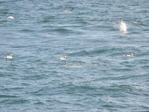 Report from Hafsúlan: The weather and sea conditions continued to be nice this afternoon. Our first discovery of the tour was a pod of Harbour Porpoises (at least 2), soon to be followed by 3 different Minke Whales throughout the course of the tour. We stayed with the first individual for almost an hour and got a lot of very close looks at the animal. Including its white patch on the pectoral fin under water – what a sight! Again, we were surrounded by many Northern Gannets (some making calls) diving into the water all around the boat and also spotted porpoises (2 or more) near the whale. The last minke we saw we were able to identify as “Happy”, an individual that we have been seeing regularly since 2008. - Carine