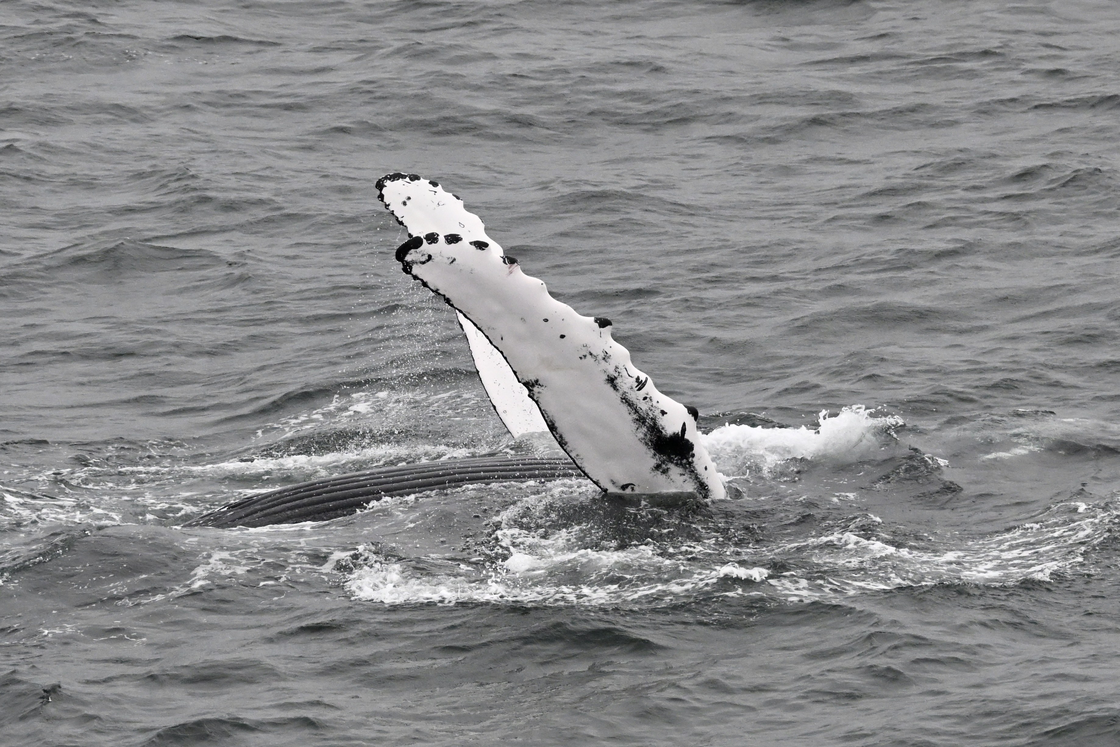 Report from Elding: The rain had stopped but the sea was still fairly choppy. Motivated by today´s sightings so far though, we sailed out. We First encountered a humpback whale, going on moderately long dives, but each time with a nice and high fluke. We then got distracted by some splashes in the distance, belonging to a pod of around 6 white-beaked dolphins. They were rapidly travelling towards us and some of them came very close checking us out! Eventually they moved on, and so did we. We then ended up in a spot with 6 humpbacks spread out. we managed to get closer looks at 3 of them, 2 were feeding in the same close vicinity so we could enjoy close looks at both whales at the same time. The third one was clearly a very big individual, moving back and forth rapidly as it was feeding, and it even treated us to 2 lunge-feeds! This encounter then ended up being our last one as it was time for us to start heading home again, leaving behind this spectacle.