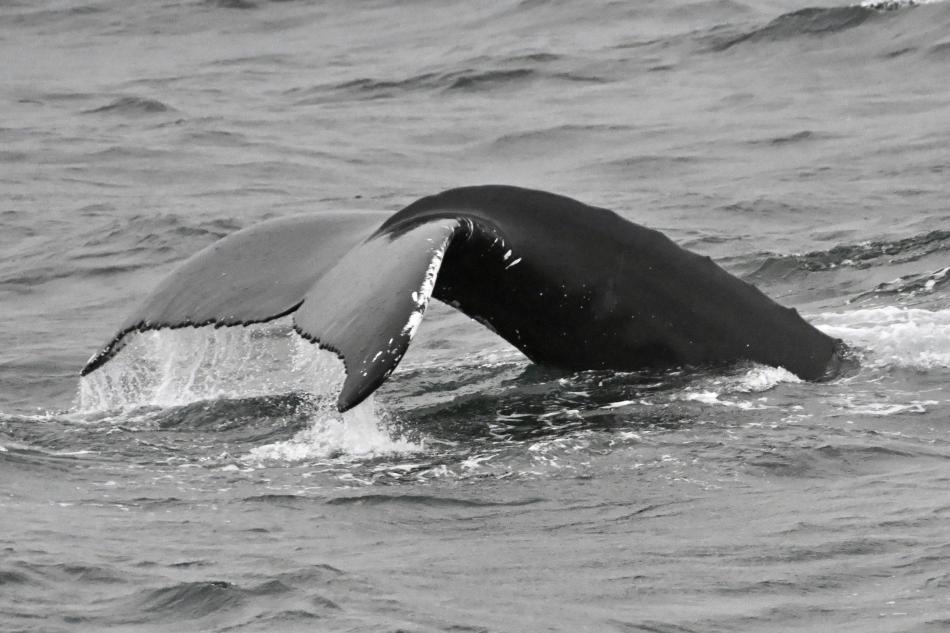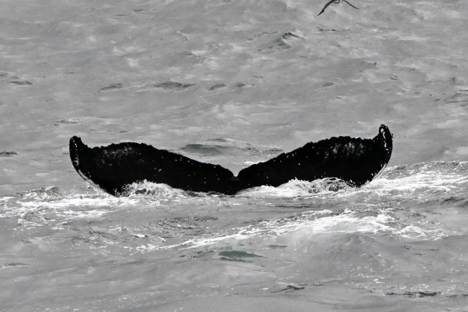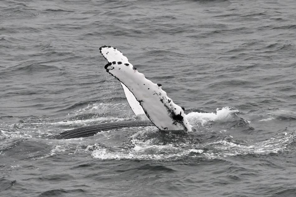 Report from Hafsulan: Sailing out this morning with a lot of rolling waves, we expected a tough time to go further out the bay to find our whales. Luckily enough, venturing towards the South were many seabirds were grouped, we got to have a great sighting: spotting altogether 4 humpback whales, we stayed with a trio of them for over an hour, as they logged/slept for the whole time. Undisturbed, they rested calmly at the surface, allowing us to see them easily for the whole time. As we were about to leave, they all suddenly woke up, and decided to fluke dive, with one even rolling with its belly up, slapping its pectoral fins a couple of times before diving down in the depths, a great way for ut to end our tour.