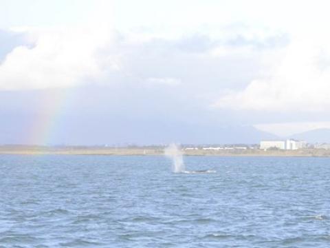 Report from Hafsúlan: We sailed out from Hafnafjörður as the Sei Whale should be close and it was, only 20 minutes sailing and we found it again. It was incredible, so big. The third largest of all whales getting up to 21 meters long and weighing up to 45 tons. What is even more interesting is that on the 4th September 2012 we also saw a Sei Whale in the eact same area, could be the same individual? well hopefully we will find out soon when we compare the dorsal fins. After over an hour with the whale with hafnafjörður in the background and a rainbow overhead. It was just perfect, also the sailing back with the beautiful setting sun.