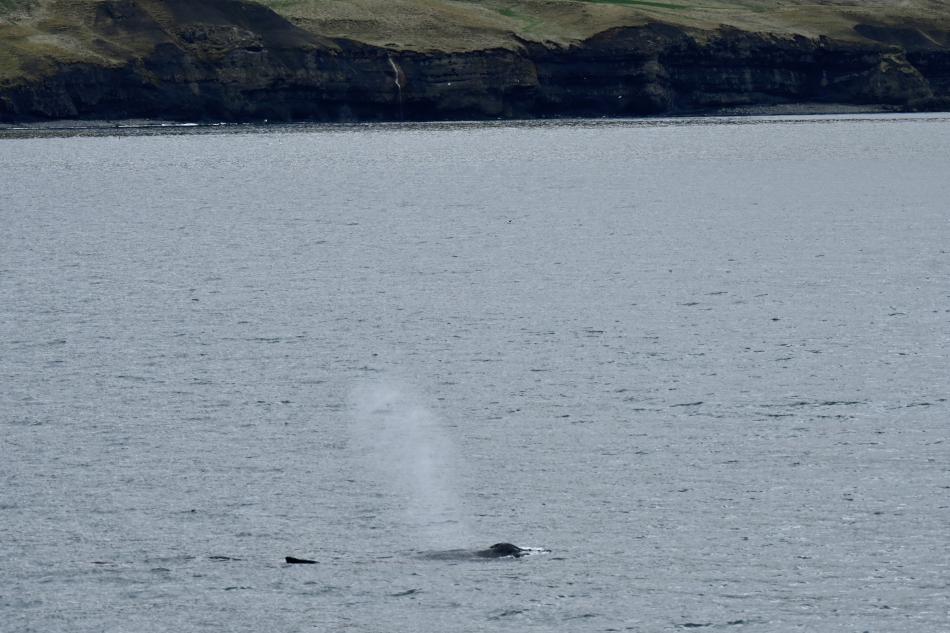 Report form Eldey: We went out to seas with a light wind from the south east. Even so it was overcast we got a great look at the beauty of Hvalfördur. The seabirds were quite busy on the surface in some places but there were no cetaceans near by. Then we came across a small pod of 3 harbor porpoises that were quickly traveling across the fjord. Shortly after, we spotted the blow of a humpback whale. So we went from the smallest to the biggest cetacean within minutes. We spend a good amount of time with the humpback. At one point it swam parallel to our boat just about an arms length away. After a nice fluke dive and some more shallow dives we had to leave and return to Reykjavik assured that all on board got a great view at the animal.
