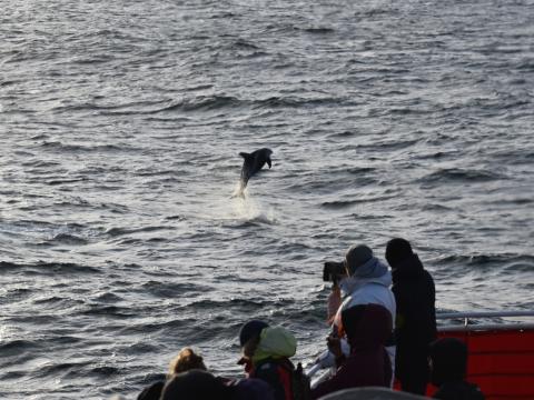 Report from Eldey: What a beautiful morning in the bay. With the sun coming up in our back we sailed out into a very calm sea today. The crystal-clear air and the magnificent view were just breath-taking. While enjoying the sun on the upper deck the time just flew by and very soon we found ourselves out in the bay welcomed by a pod of 4-5 white-beaked dolphins. This first group showed some acrobatic jumps when we approached them and then sticked around the boat for a little while probably watching us while we were watching them. A little later we had a brief encounter with another two white-beaked dolphins - a mum with her calf. The young was still quite small and always stayed very close to its mum. They surfaced a couple of times in less than 20m to our vessel before we decided to head further out. On our big circle out in the bay we saw another pod of 5 white-beaked dolphins which traveled by and then started breaching when there was some distance between them and the boat. Wow! What a great show!! On our way back we spotted a big flock of feeding seabirds making us hope to spot some bigger whales in the area. Thus, we waited quite a while watching the birds and scanning the water surface for any sign of cetaceans. But nothing... So we started making our way back to Reykjavik. But then, when the boat just reached some speed, another pod of dolphins showed up approaching us from the front. But when we stopped to watch them we were surprised by another bigger animal: A minke whale surfaced a couple of times in some distance. What a nice end of a great morning tour!