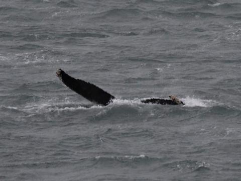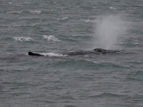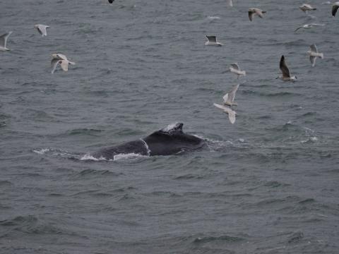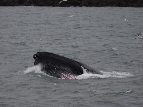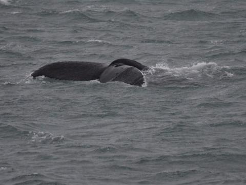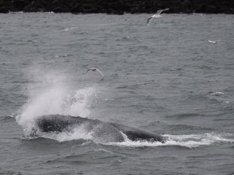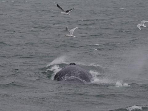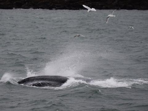 Report from Eldey: Wohoooo what a tour. I guess no one was expecting this when we left the harbour with strong winds and hail! But what can I say, that's mother nature. The swell had definitely calmed down since yesterday so waves were no problem. Just for the first half hour it was actually difficult to even look ahead due to the hail. But then, out of nowhere, a lunge feed of a humpback whale!! It was the same whale as we have been seeing since January 4th, but today actively feeding and thrusting it's widely opened mouth out of the water, with it's throat expanded, feeding on the big quantity of fish that were at the water surface. Together with it were numerous species of sea birds, at least 3 harbour porpoises and a very curious harbour seal. After the humpback had obviously filled up it's stomach, it began moving around the area, even lifting it's fluke several times as it got into deeper waters, but still staying with us for over an hour. The rain stopped and we could even enjoy the sun peeking through the clouds on our way back to harbour. So. Much. FUN!
