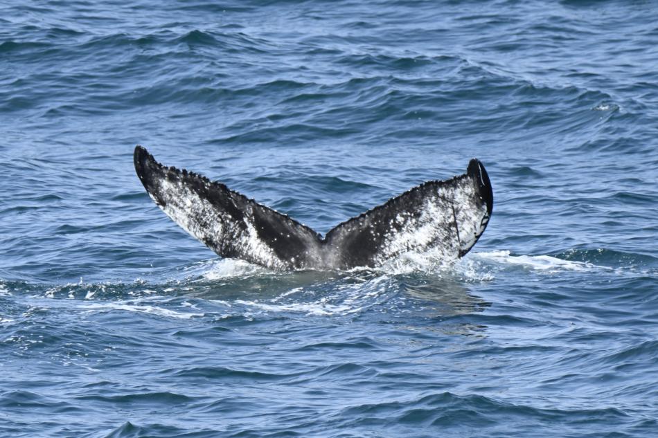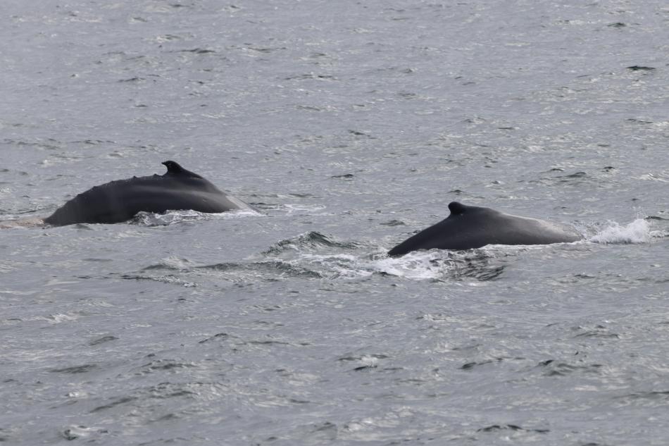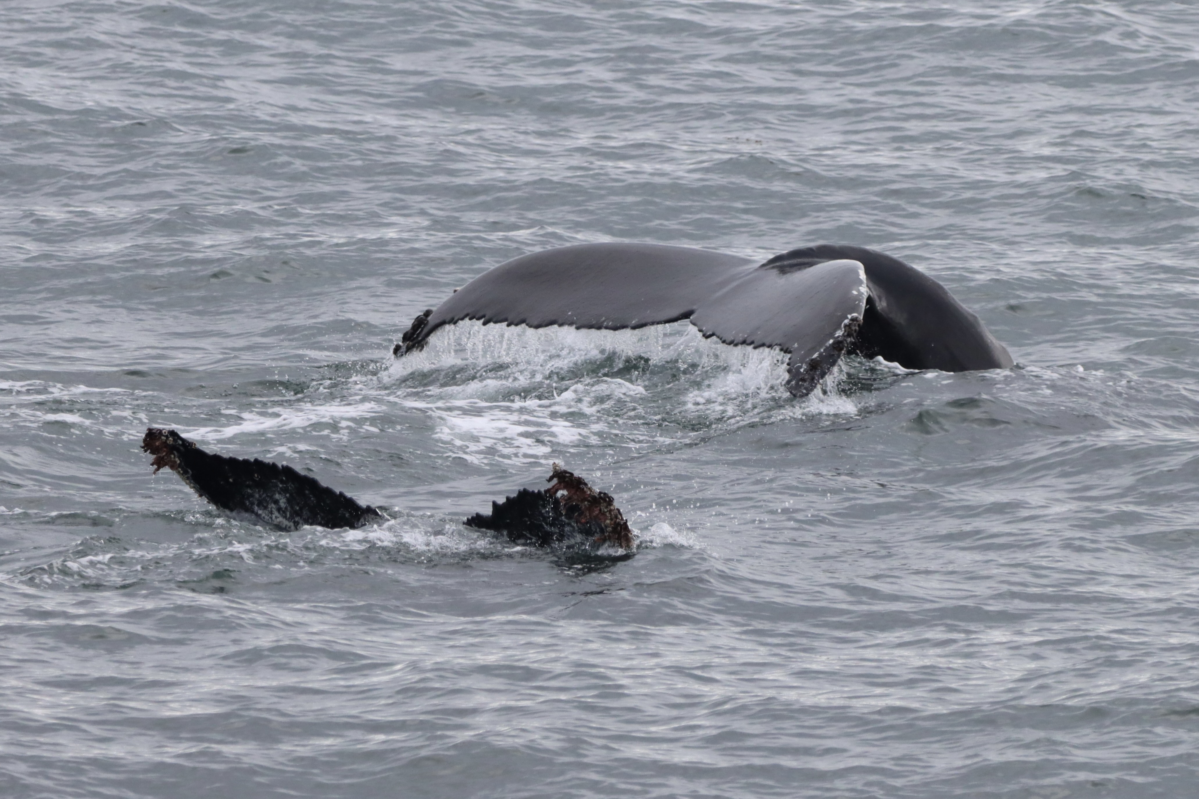 Report from Eldey: It was a nice overcast morning on the bay today as we sailed into Faxaflói to look for some cetaceans. After about an hour of searching, we spotted one blow in the distance! But before we could take a look at this animal, many small fins started to appear on our left-hand side! These were white-beaked dolphins, and a big pod of about 15-20 individuals too! Some of them were leaping out of the water! Then we saw another blow in the distance, and we decided to check it out. Suddenly, this blow turned into two blows and we could see a pair of humpback whales swimming together side by side! These two whales stayed together for the whole encounter, never straying more than a few meters away from one another, and they gave us many beautiful fluke dives! In this area were also two minke whales, so it was apparent that there was a lot of food here. After this we said goodbye to the whales and headed back to land happy after a great encounter!