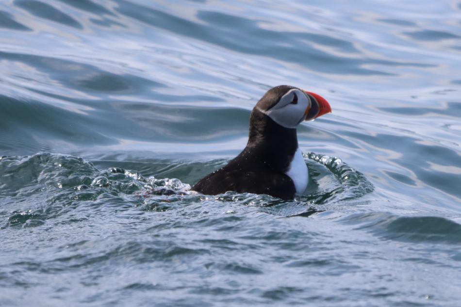 Report from Eldey: the weather was lovely this afternoon as we sailed out under a bright, warm sun wind the wind in our backs. On this tour we saw 2 minke whales even though we only saw them very shortly, surfacing a couple times. But no matter! We also saw 2 humpback whales both of then swimming very calmly by themselves, fluke-diving very often and staying nice and close to our boat. We were even able to spot their majestic dorsal fins through the water! After a nice long time with the humpbacks we got to sail back home incredibly happy about the afternoon.