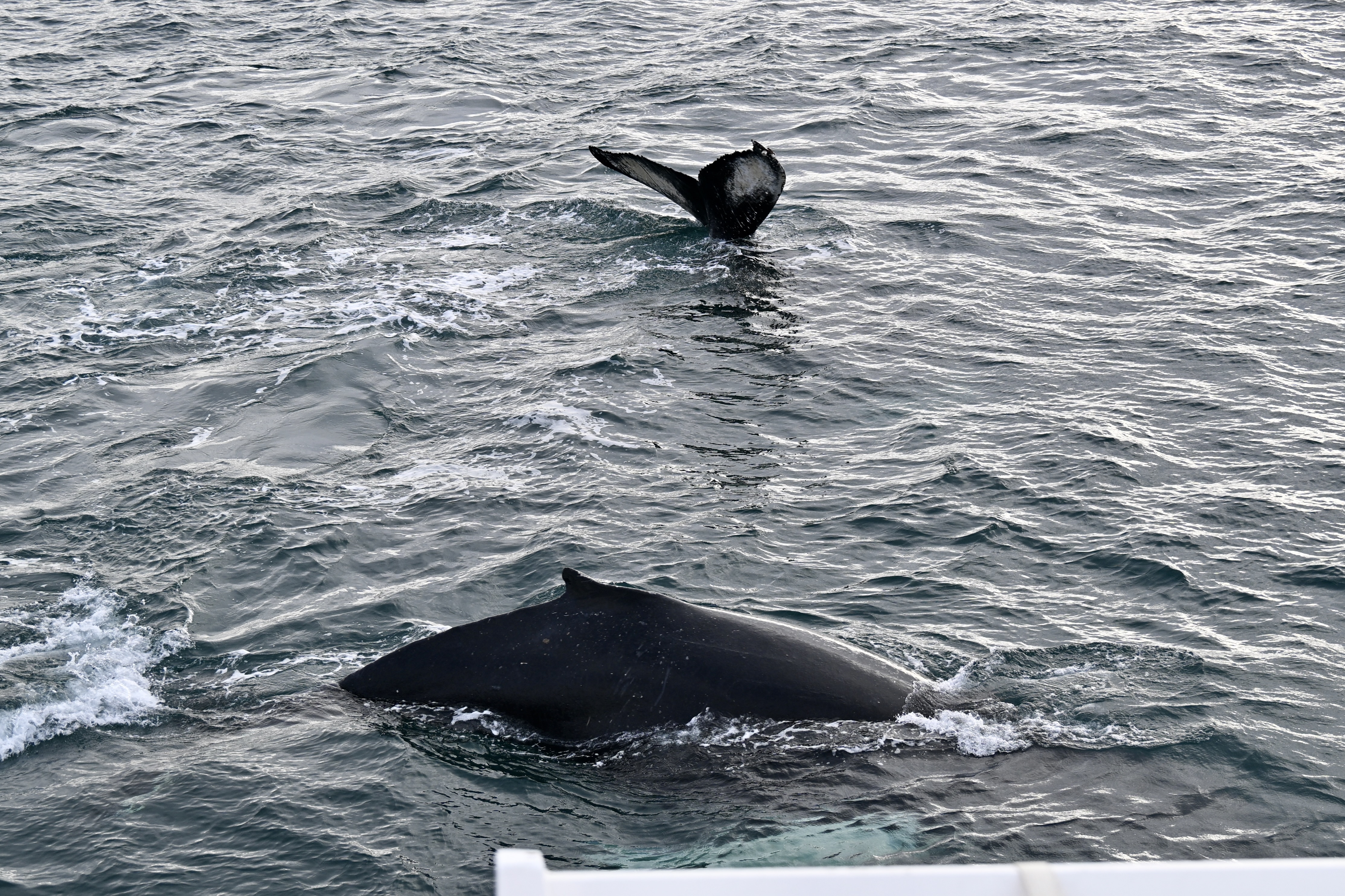 Report from Eldey: During this cold morning we sailed into the bay with a small swell and a bit of wind we enjoyed our morning coffee and watched the sun rise. About 20 minutes after leaving the harbour we started seeing the first sights of wildlife. We spotted 2 humpback whales were traveling fast even further into the bay getting in very shallow waters close to Videy island! We had the chance of seeing them fluke multiple times before time started to run out and we needed to return to the harbour.