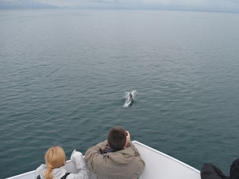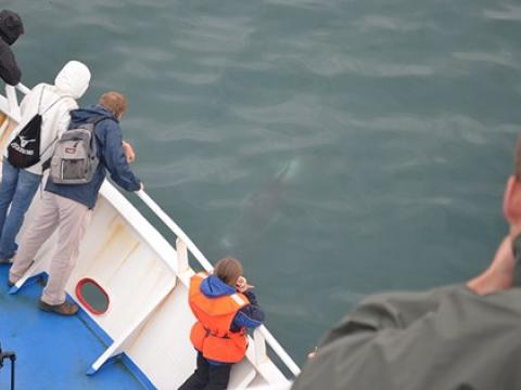 Report from Hafsúlan: This tour was incredible like the other tours of the day, everything was at it's best, the weather, the sea, the birds and the whales, even the fish were feeling left out and tried to show themselves! We headed out to the mirror calm Faxaflói bay and went to Akurey to take a look at the puffins. After that we sailed out and we did not have to look for long before we saw a pod of white-beaked dolphins. We enjoyed their company for a while, they were in no hurry and neither were we. At last we took of to search some more and after a little while we spotted a minke whale, the minke was just like everything else this afternoon, very calm and in no hurry to go anywhere. After a nice time with the minkie we went a little bit further and after only few minutes we spotted another pod of white-beaked dolphins and these dolphins were incredible, played all around the boat, surfaced very close and even jumped out of the water in front of us! When we sailed on they road the pressure waves as a goodbye to us! Sailing on from these awesome dolphins we soon spotted some harbour porpoises that allowed us to get a good look at them. This was a perfect ending to a perfect tour.