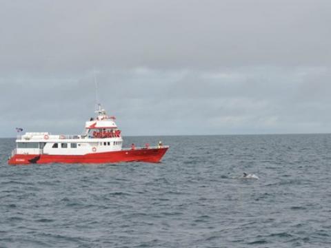 Report from Elding: There was an eerie mist in the bay this morning making it impossible to show our passengers the beautiful landscape until later in the tour when the mist cleared and even the sun shone through from time to time. We sailed out into Faxaflói to our main whale watching area, 30-40 minutes from the harbour and soon found an awesome Minke Whale that surfaced just meters infront of us. Seemed to be feeding near to a flock of resting puffins, guillemots and arctic terns. This minke whale great but after a while we decided to leave it in peace and head further offshore. Soon we came across a pod of 5-7 White-beaked Dolphins which were really difficult to count as they were surfacing everywhere and always changing direction. Before the end of the tour we saw another 3-4 Minke Whales but the highlight of the tour was a pod of 4 Killer Whales, a rare sight in the bay during the summer. They were fantastic, tail slapping, sharking and surfacing altogether, 1 male and 3 females. An incredible morning in the bay today.