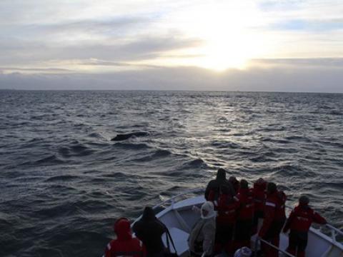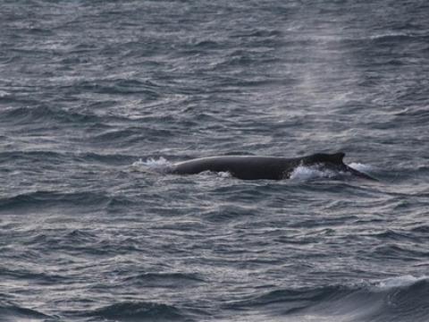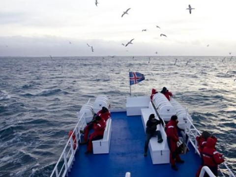 Tour at 13:00 Report from Elding. Today we went from Sandgerði, it was a beautiful day, very sunny but cold however using our overalls you would make you feel pretty warm and toasty. The first thing we spotted just as we were leaving the port was a grey seal, it popped up a few times and we could see it very well. As we continued with our journey we noticed that there were thousands of birds feeding on the abundance of herring that we could smell in the air. We decided to sail along the coast towards a gethering of fishing boats to try our luck. This paid off as suddenly there was a blow from a Humpback Whale, we approched him/her and after a while we noticed that there were two Humpback Whales in the area. We told the passengers to visualized the tail of the whale and moments after he/she showed us it´s great tail; passengers and crew were really happy and excited. After some time with the whales we decided to head back and on the way we got to see the fishing boats hauling in their catch and hundreds of Gannets plunging into the water all around.