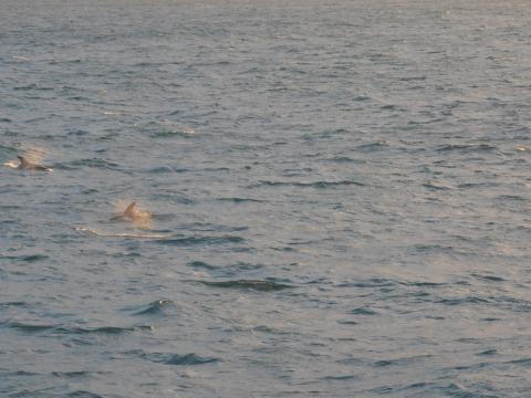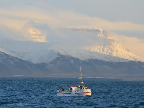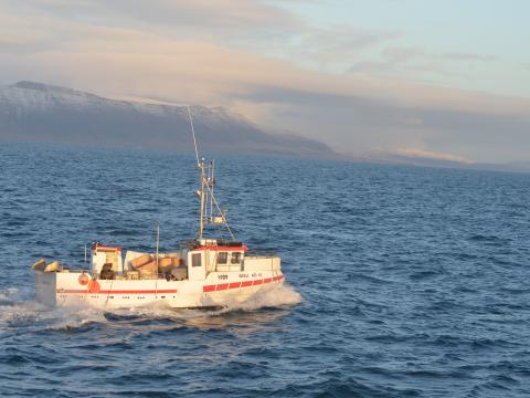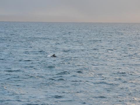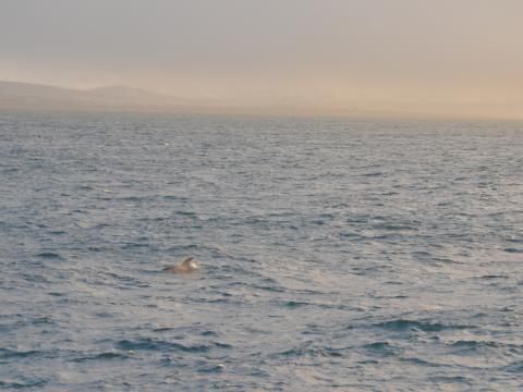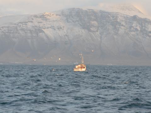 Report from hafsúlan: the bay was beautiful this day, it had snowed in the night so the mountains around us were white and the sun gave the clouds orange and red colors. We had only sailed for 30 minutes when a passenger spotted a dolphin on one side of the boat. We stopped to have a look at this animal and realized it was a white-beaked dolphin. At first we could only see two but after some time we saw at least 4 individuals. The dolphins were most likely feeding, they kept changing directions but were more or less always in the same area. We sailed further out on the bay to check if we could find something else but we couldn’t.