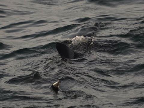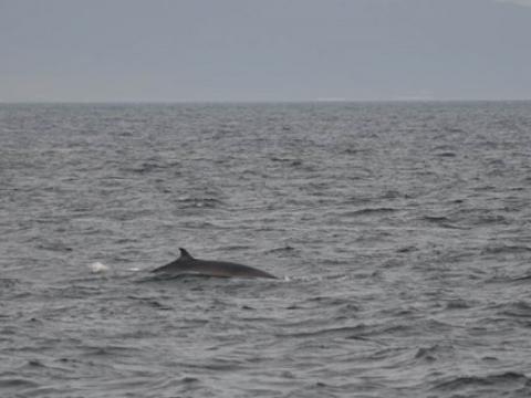 Report from Hafsúlan: The wind was getting less and less throughout the tour and the sun was lurking out between the clouds. On our way into the bay of Faxafloí we spotted a harbour porpoise. We waited for several minutes but the animal did not surface again and therefore we left for the inner part of the bay. Much birdlife was visibile, which increased our hopes for a great whale encounter. Suddently, a minke whale surfaced as close as 50 meters from us and moved in closer with every surface. The minke whale was later identified as 'Base SQR' and has been seen ever since 2008. The whale surfaced often and changed its direction constantly, thus we assume it was in the pursuit of some food. Later, when we left this minke whale we found 2 other minke whales and each time close to a flock of birds. However, the individuals were more elusive than the first minke whale. In summary, we had a fantastic tour and found an old friend.
