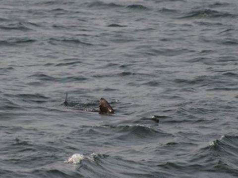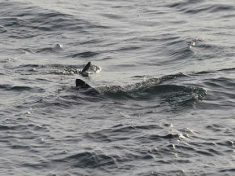 Report from Hafsúlan: The tour started out with almost no wind, moderate amount of sunshine and calm sea - excellent whale watching weather. Initially, we had to search for quite some time before we spotted a blow in the distance. This blow belonged to a minke whale that surfaced next to us just minutes after. At first we thought it was only one individual, but over the course of several minutes it turned out that there were at least two, maybe three minke whales around us. We followed two minke whales that popped up next to each other several times. Both individuals gave us great opportunities to look at their dorsal fin and black back. Then we made for a different area and found a flock of feeding northern gannets plunging down to catch fish. Suddently a minke whale shot up inmidst of these birds. But something else was lurking in the waves beneath these feeding birds. When we were getting closer we found out that there was a basking shark feeding together with the birds and whale. The individual was about 2-3 meters and thus 3-4 years of age. Now, we were able to observe the minke whale and the basking shark at the same time. Such a great and special ending to this day.