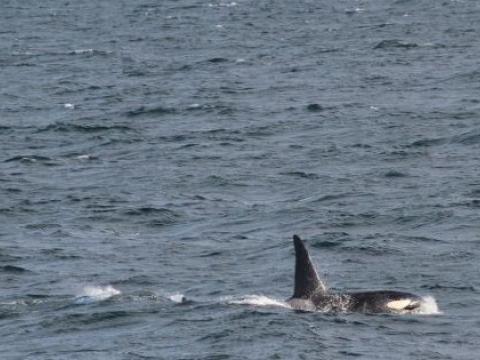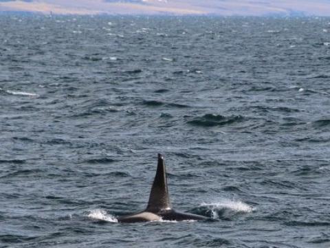 Report from Hafsúlan: this morning we had very nice weather although the sun wasn't shining. We had sailed for about 30 minutes when we saw the huge dorsal fin of the great Orcas. They were so many, at least 20-30 animals. Again we could spot the mothers with the youngs and the males close to them. They were moving very fast and were obviously hunting as you could see the flock of birds over them and diving down when the killer Whales came up from their dive. Such a beautiful sight, we were amazed. But then something more amazing happend, one of the Orcas came you just beside the boat two times, and for the second time it stayed there for a few seconds and we could get a very good look at it. What an amazing tour with these gorgeus animals.Birds seen on the tour include: Fulmars, Black-backed Gulls, Eider-ducks and cormorants.