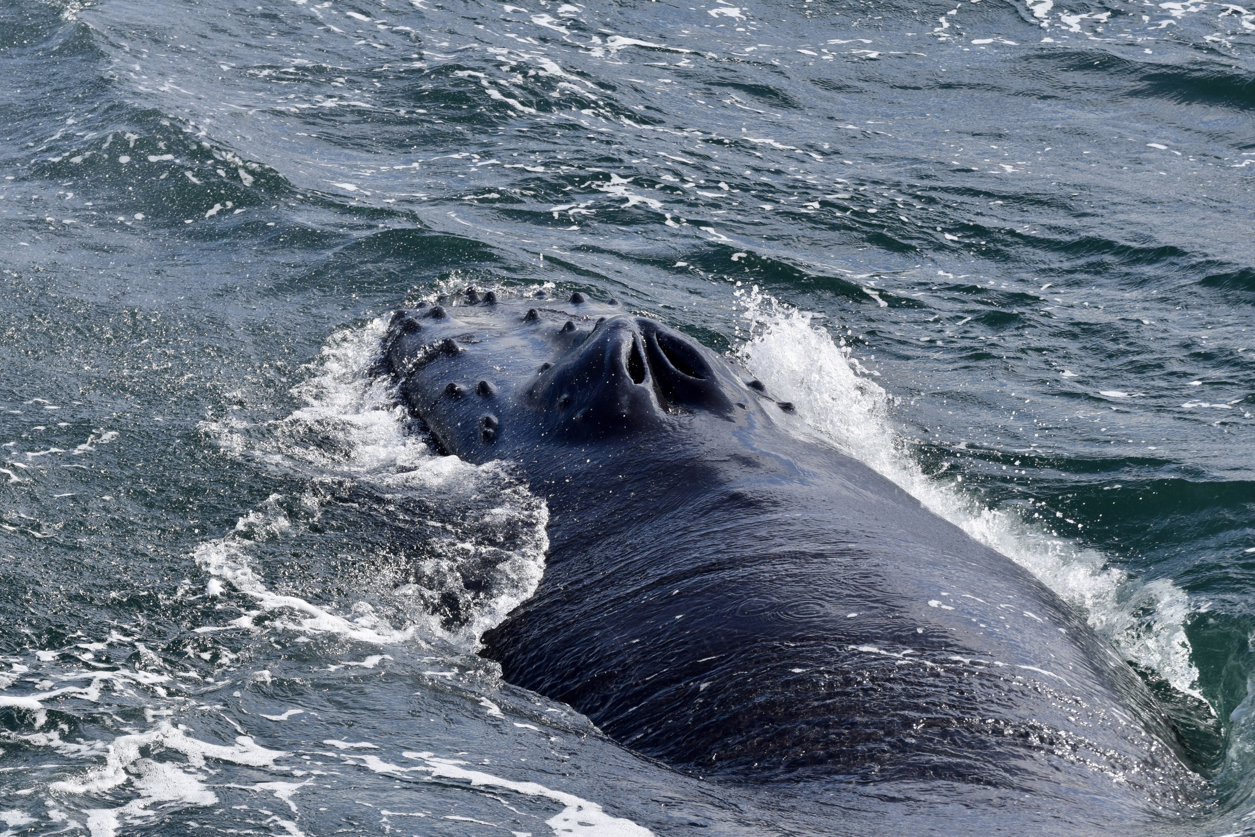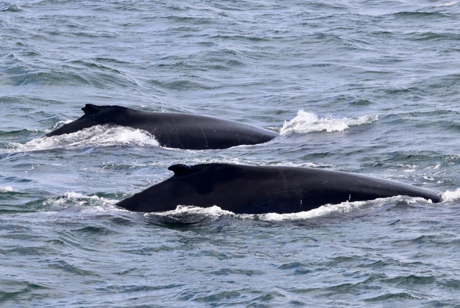 Report from Hafsúlan: The sun had poked its head through the clouds as we made our way yet again into the bay of Faxaflói. The waves had calmed a bit, and the sun was shining! We made our way to the same feeding ground we had explored earlier and found 3 humpback whales swimming together in tranquility, almost in sync! One of the whales we knew very well from the V-shaped nick in his dorsal fin, it was Davy Jones II! We watched Davy and his buddies as they swam calmly through the bay, then we made our way further down south to find two more humpback whales feeding away, but taking longer dives. In the distance, we could also see another blow! After a while spent with these humpbacks, we took the scenic route home and enjoyed great views of the Reykjavík skyline to top off this amazing tour!