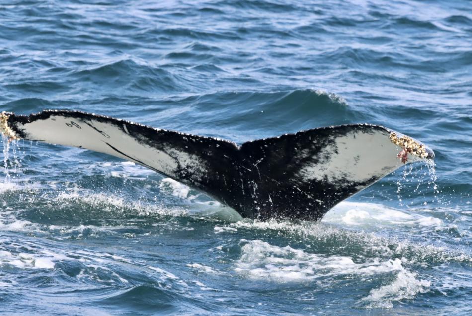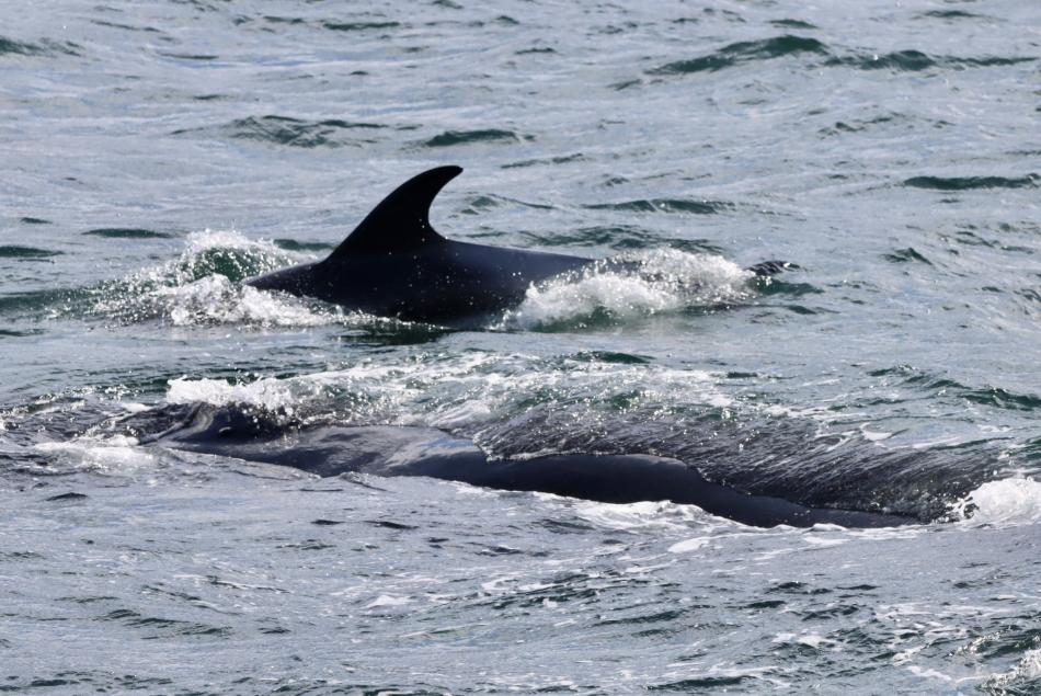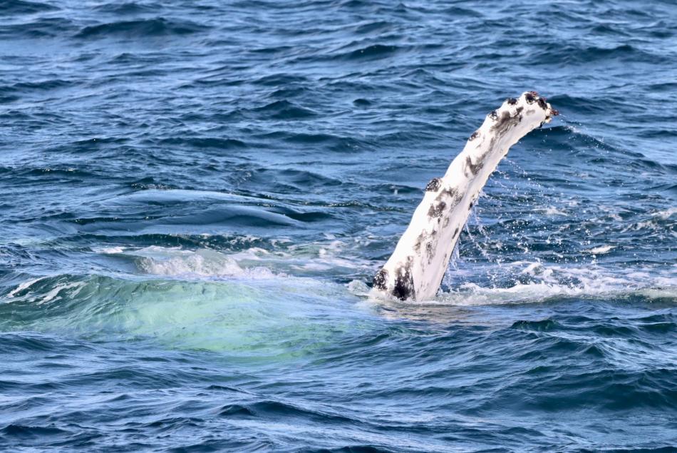 Report from Hafsúlan: We started the tour with a little bit of rain but soon after we left the harbor the sky cleared and we enjoyed a sunny tour! It wasn't long until we encountered our first whale, a humpback whale swimming leisurely around the bay, giving us a few good fluke dives before we moved on! Then, we saw a pectoral fin in the distance and hurried over there to find another humpback whale, pec slapping and rolling, and then we saw why! There was a small pod of 3-5 white-beaked dolphins playing with this humpback whale. We watched with awe in our eyes as they moved so effortlessly, almost as if they were dancing together. After we had enjoyed their company for a while, we moved on to find our third and final humpback whale of the tour, who we spent a few minutes with before returning to land.
