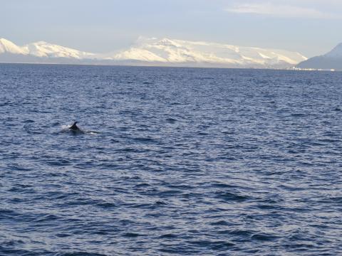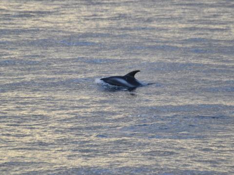 Report from Eldey: This morning was so beautiful! The morning sun casted orange and pink colors on the clouds and mountains around the bay. There was hardly any wind and the sea conditions close to perfection. To our surprise no animals were seen in the areas where we found so many birds, dolphins and minke whales feeding yesterday. It was not until we sailed further south that our first animal popped up, a minke whale! It was elusive and only seen a couple of times. Soon after we left the minke some white beaked dolphins showed up. Although there seemed to be quite a few dolphins around, they were so scattered that only 2 were seen within 500 meters of our boat. One juvenile and one adult, likely its mother. On our way back we saw two pods of harbour porpoises, with together around 7 individuals. Although we had some sightings we decided to hand out return tickets to those that felt they had not seen the animals on the tour.