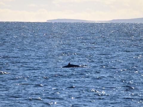Report from Hafsulan: It's getting cold in here! Fortunately though, the wind was calm and we got bright sunshine to help us stand the increasing cold. We enjoyed the views the bay offered us until we spotted water splashes coming our direction. It was a pod of 6-8 harbour porpoises coming toward our boat! They kept surfacing and closing in with us, behaviour unusual enough for yours truly to mistake them for dolphins. The encounter was short but fruitful, so we headed further west until we encountered a pod of 5 white-beaked dolphins. They were swimming fast and straight away. They were coming up frequently enough to be predictable, so we could follow them easily until they decided it was enough and got off the grid. At the beginning of the encounter with them we also spotted a tall blow so we went back on our step and found a very shy minke whale. It was difficult to follow it, and during our patient wait for it to come back, the craziest thing happened! Out of nowhere, a humpback whale breached in front of Hafsulan! Jackpot! We ended staying with this humpback whale for about half an hour. It was never diving deep and long, and even displayed some lunge feeding. This humpie was having a snack just below the sea surface. After running out of time, we made our way back toward Reykjavik, but not without seeing once more the minke whale and a couple of porpoises. 4 species tour fellas!