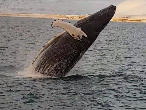 Report from Hafsúlan: WHAT A AFTERNOON!! The winter light was incredible and shone a warm light over Viðey the humpback whale tha we spent a lovely time with. We saw a mixture of behaviours from viðey breaching out the water to exfoliating