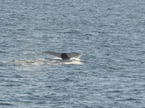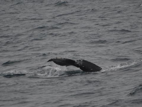 Report from Eldey: Still strong winds from the north, making the swells hit us from the side as we headed out in Faxaflói. After only 40 minutes of sailing the guide spotted very big splashes in the south. Three big splashes were seen towards the horizon,