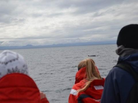Tour at 13:00: Report from Hafsúlan. We sailed out from Reykjavík and headed straight to where we had seen the humpback whale this morning. We came in to a big flock of birds and then we saw a humpback whale. We sailed towards it and saw that these were actually two whales. We watched them for a