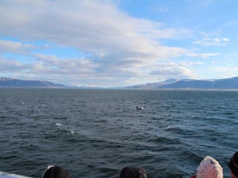 Tour at 13:00: Report from Hafsúlan. We sailed out from Reykjavík, it was a bit windy. We set sail to where we had seen the whales this morning. On the way we see two pods of Harbour Porpoises, probably around 20 individuals together. We didn't stop to watch them but continued sailing. When we g