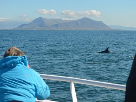 Report from Elding: We just simply can't get enough of these midnight tours! The beauty is really indescribable with the sun sitting behind Snæfellsjökull (Snælfellsglacier) and lot of colours in the sky. We managed to find a small pod of white-beaked dolphins and they w