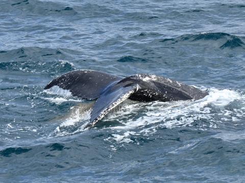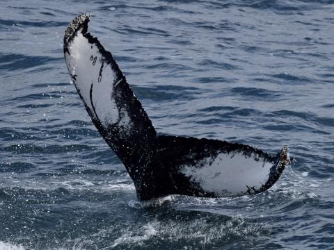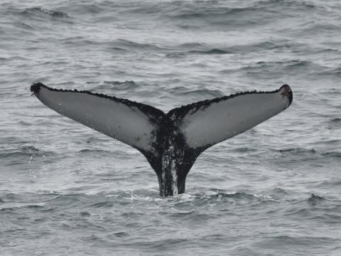 We went out at 13:00 during a break in between rough weather. We quickly found a minke whale and got the opportunity for some pictures. We went on and saw blows of 2 humpback whales in the distance and were able to spend some time with them as the showed us some fluke dives. All other tours today were cancelled due to unfavourable weather at sea.