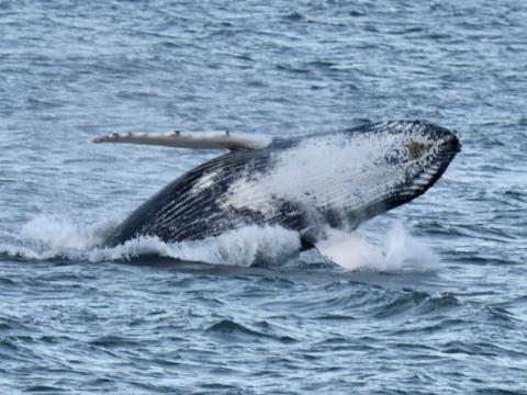 This morning featured minke whales feeding beneath diving seabirds, a brief sighting of harbour porpoises and playful white-beaked dolphins bow-riding near the boat. The afternoon brought spectacular action from five humpback whales, including surface lunges, fluke dives and peduncle throws! The evening tours ended up being cancelled due to weather.